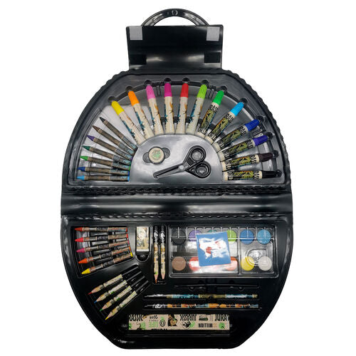 Size: 38x21x4cm. With this original activity set in a moon-shaped case you can keep your school supplies organised. Inside it includes various art and stationery accessories: 12 felt-tip pens, a pencil sharpener, plastic scissors, an eraser, 12 crayons, 6 coloured pencils, 2 pencils, a ruler, a paintbrush and 12 watercolours.