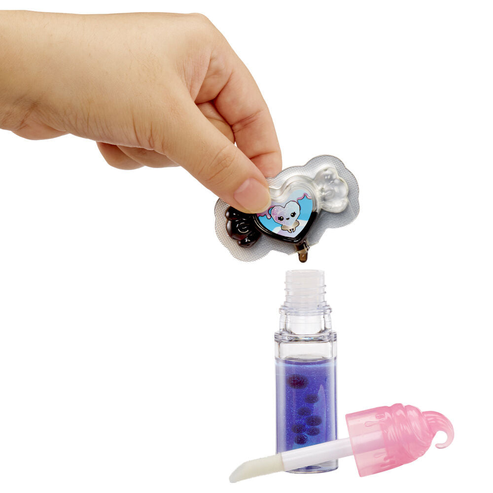 Age: 4+. Inspired by traditional sour sweets. Add the secret scent from the bottle to the lip gloss. Add the glitter. Stir to mix everything well. Apply to the lips.